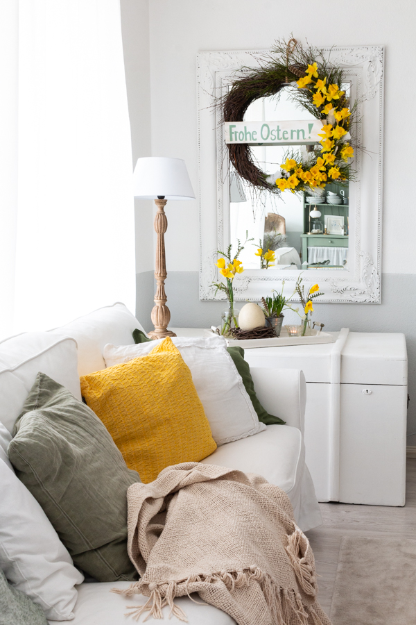 Welch eine wundervolle österliche Frühlingsdekoration, liebe Yvonne…alles so stimmig und gemütlich bei dir, da würde ich mich gerne auf der Couch niederlassen und den Anblick rundum genießen. Toll finde ich, dass der Kranz so wandelbar ist…ich liebe Dekorationen, von denen ich länger als nur eine Saison etwas habe. Den Link werde ich mir gleich mal ansehen.